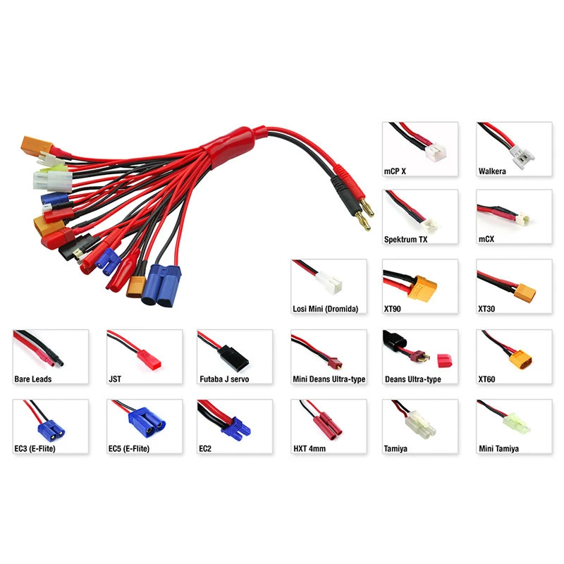 This charge lead set features all of the most popular charging connectors including Deans Ultra-type, XT60, and EC3, plus many new popular connectors including XT30, XT90, and EC5! Includes 4mm banana plugs that fit most serial chargers.