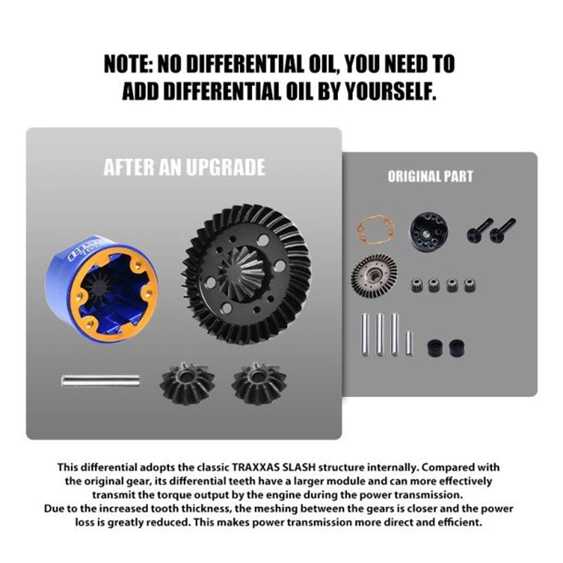 Tech Notes: This differential adopts the classic Traxxas Slash structure internally. Compared with the original gear, its differential teeth have a larger module and can more effectively transmit the torque output by the engine during the power transmission. Due to the increased tooth thickness, the meshing between the gears is closer and the power loss is greatly reduced. This makes power transmission more direct and efficient.