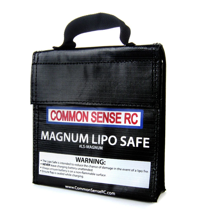This is the Common Sense RC Magnum LiPo Safe Charging & Storage Bag for up to 8S Batteries. The Magnum Lipo Safe (7″ x 6.25″ x 1.75″) is the right size to fit everything from small 3.7V LiPo batteries up to even large 29.6V (8S) Lipos. It features both a heavy-duty handle and elastic straps inside the bag to secure your lipos in place.