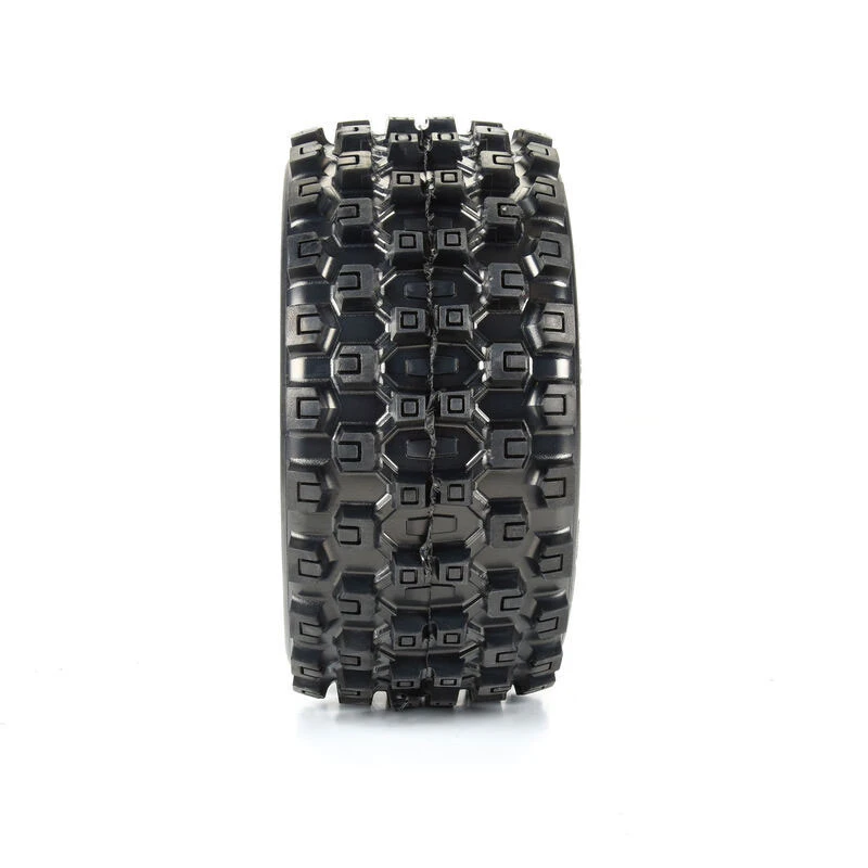 Pro-Line Badlands tires are known for having a sweet Motocross inspired tread and the Badlands MX43 tires kick that up a notch with a Bigger and Bolder knobby tread that matches modern MX tire design. These tires have been developed from the ground up for extreme X-MAXX punishment with an ultra-durable compound that prevents tire ballooning even at high speeds. The Badlands MX43 features Pro-Line’s groundbreaking proprietary Pro-Loc Technology that creates an ultra-secure bond to Pro-Line’s Limited Edition Impulse Pro-Loc X-MAXX wheels while still being removable when required. The Badlands MX43 is a true All-Terrain tire that will find traction on any surface but is best suited for loose & loamy dirt, mud or grass.