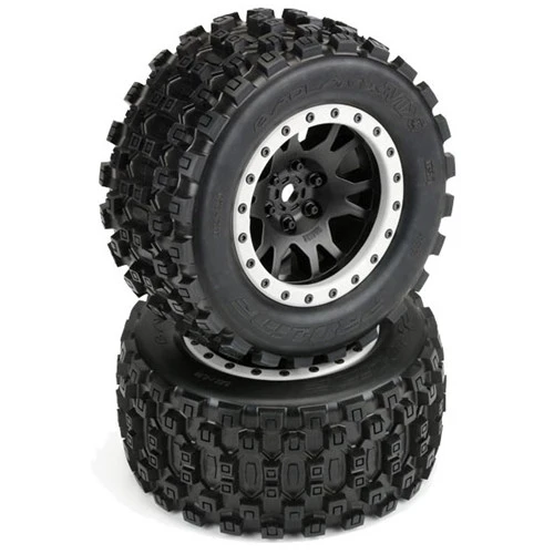 This is a pair of Pro-Line X-Maxx Badlands MX43 Pre-Mounted on Pro-Loc Impulse Black/Grey Wheels. These tires stand a massive 8.3-inches tall and are constructed with an
