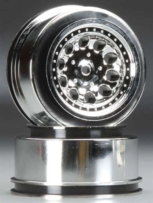 These are the RPM Chrome Revolver 2.2/3.0 Wheels for the front/rear of Traxxas 1/10 Slash 4×4, and rear of Slash 2WD Short Course trucks. These feature splined drives instead of hexes for incredible strength. Spline adapters are included.