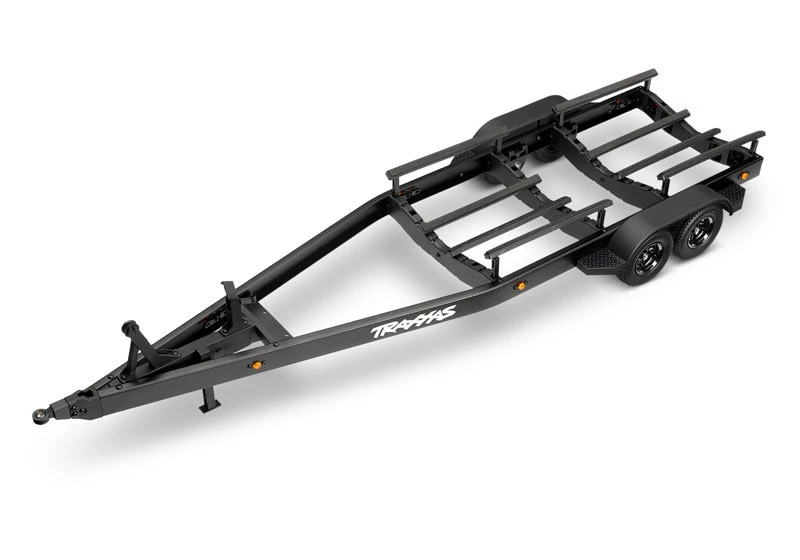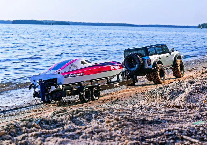 Transport your Traxxas Disruptor to the lake in style with this fully detailed scale replica tandem-axle trailer. Elastic tie-downs hold the boat securely to the trailer’s lightweight, full-length aluminum frame. You can even challenge your trailering skills by backing the trailer onto the ramp using your TRX-4 or Traxxas Ford Raptor R with the included variable-height hitches.