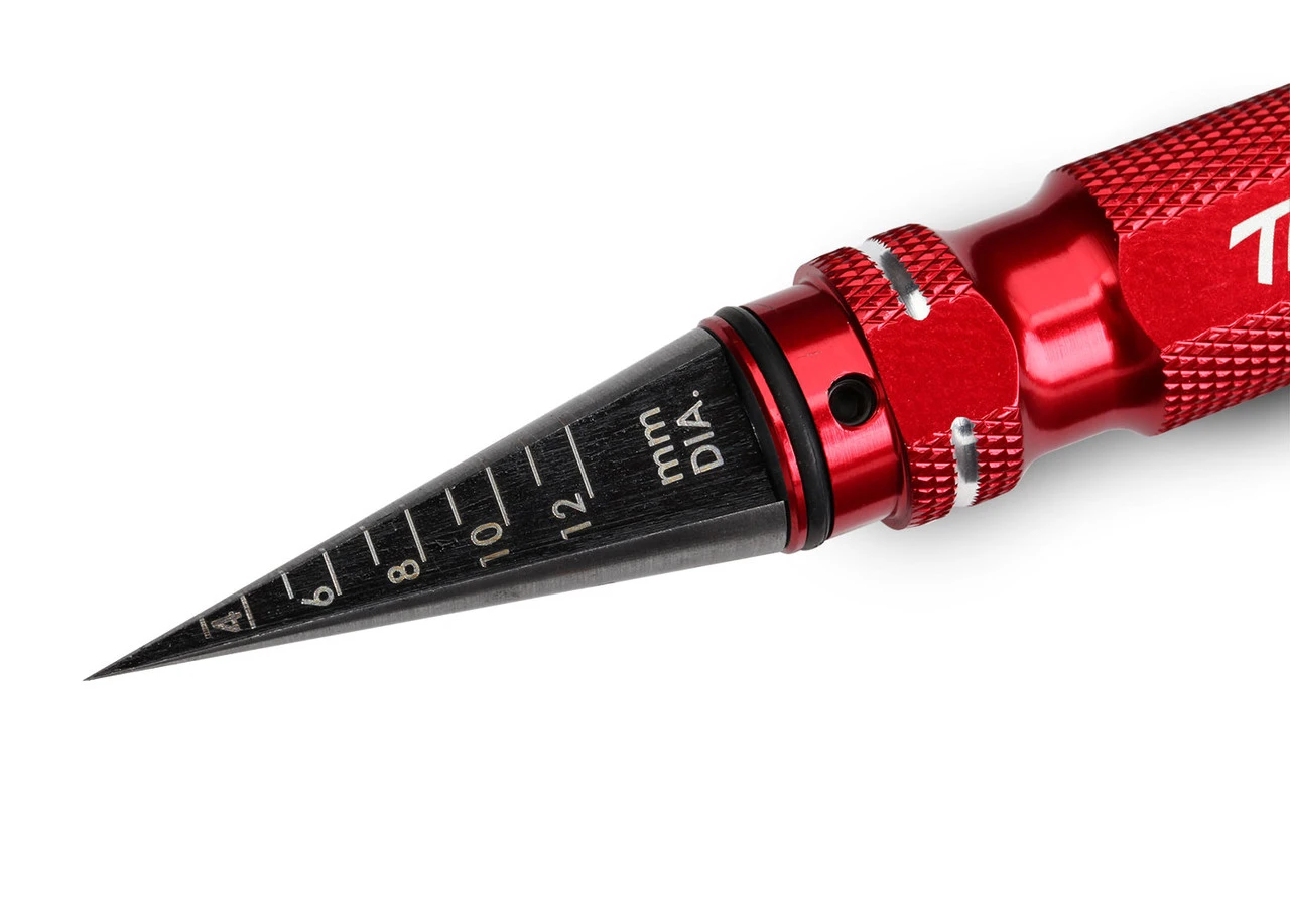 This is the Traxxas Aluminum Handled Body Post Hole Reamer with Cap for Lexan RC bodies. With a crisp steel cutting edge and included aluminum cap for protection, this is not your average body reamer. The tip features both metric (mm) and inch diameter markings to easily show the diameter hole that has been cut based on the depth on the tip. These are a must for anyone working with Lexan RC car and truck bodies.